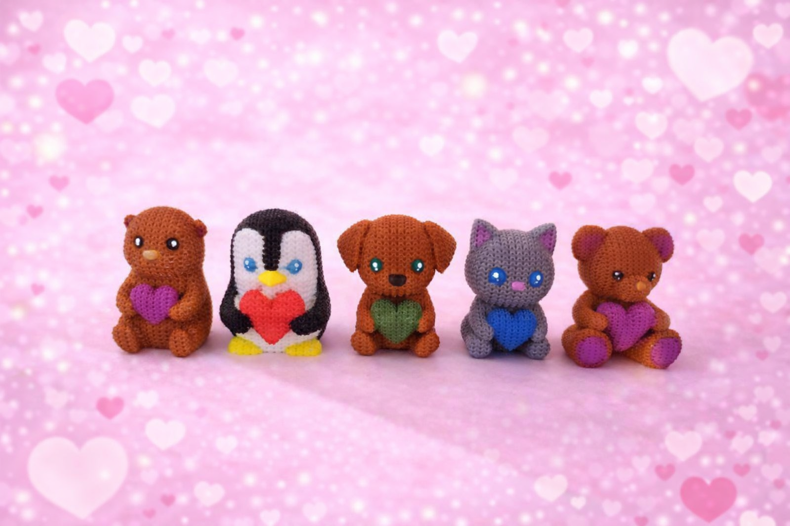 Calin le chien, Choupette le chat, Doudou la loutre, Guimauve l'ourson, Frisson le pingouin, Papouille l'escargot