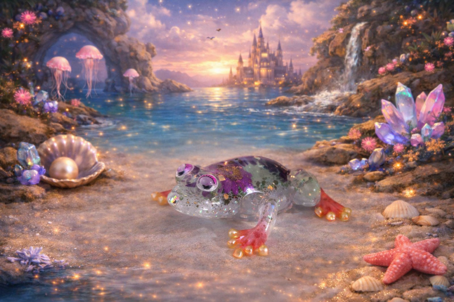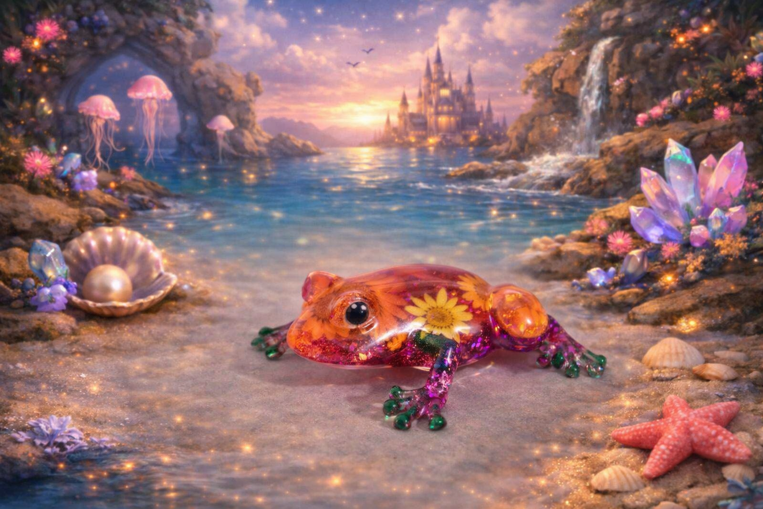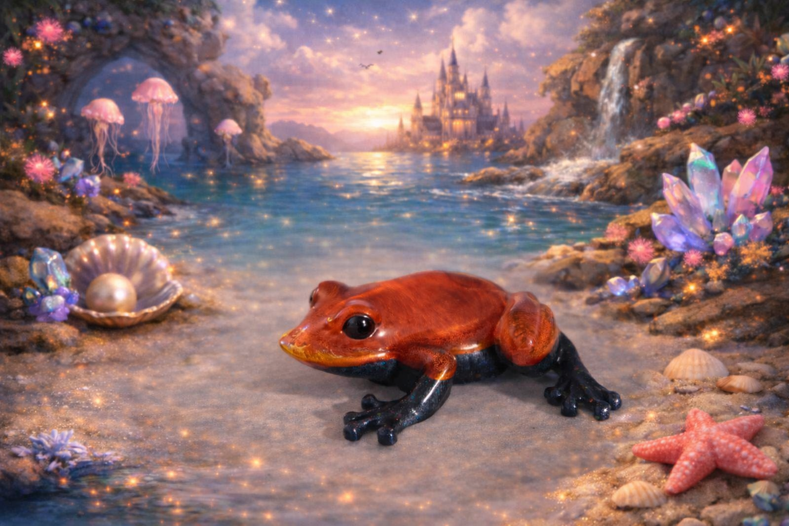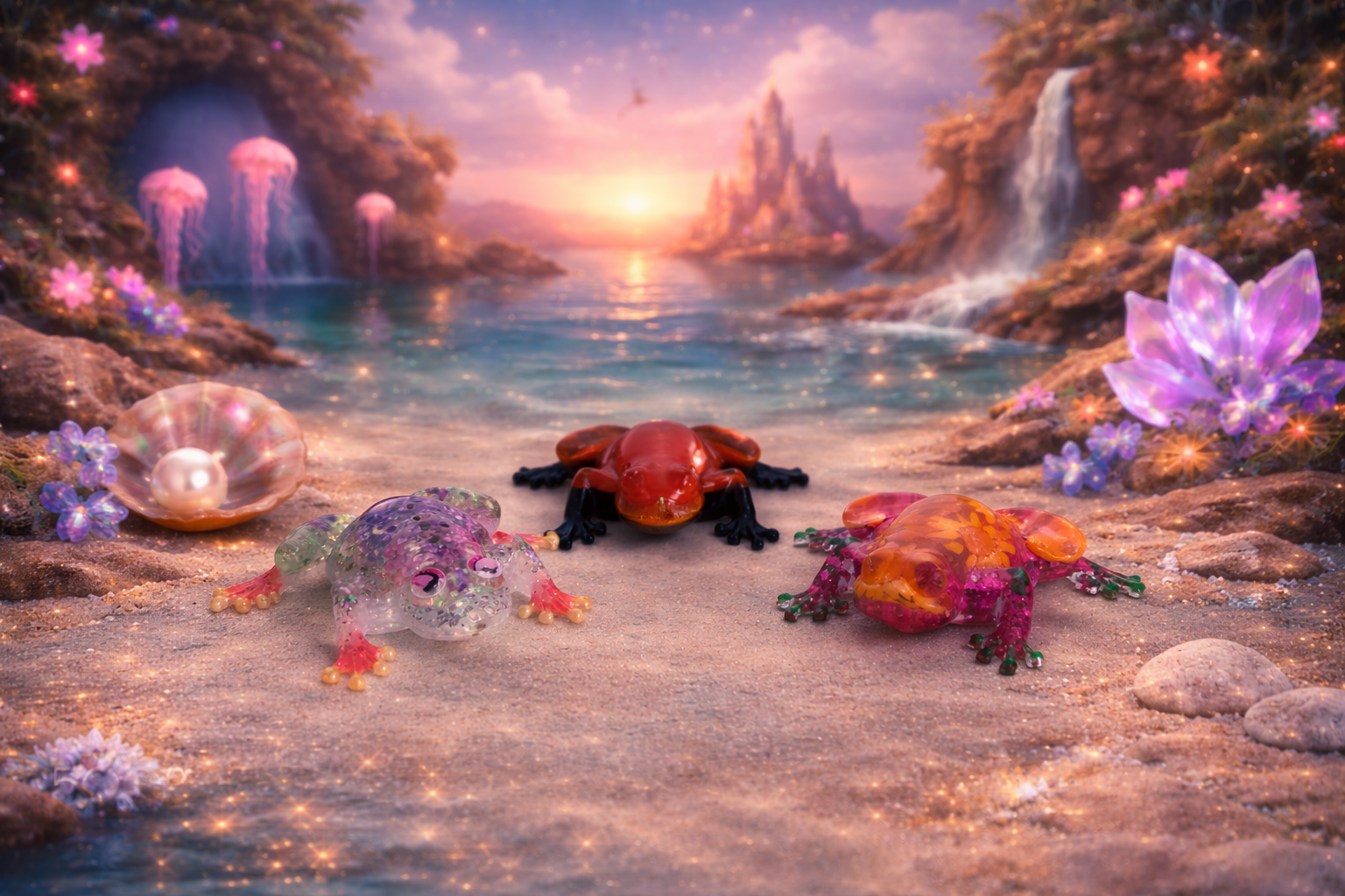 Grenouille rouge et noir effet pouring, Grenouille fleurs et paillettes roses, Grenouille fleurs et pierres