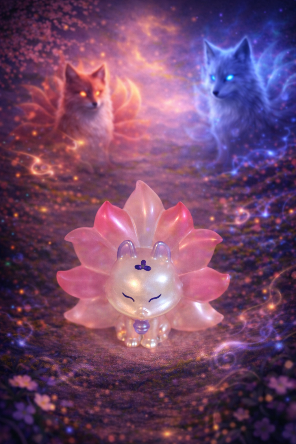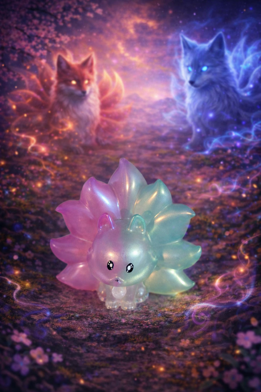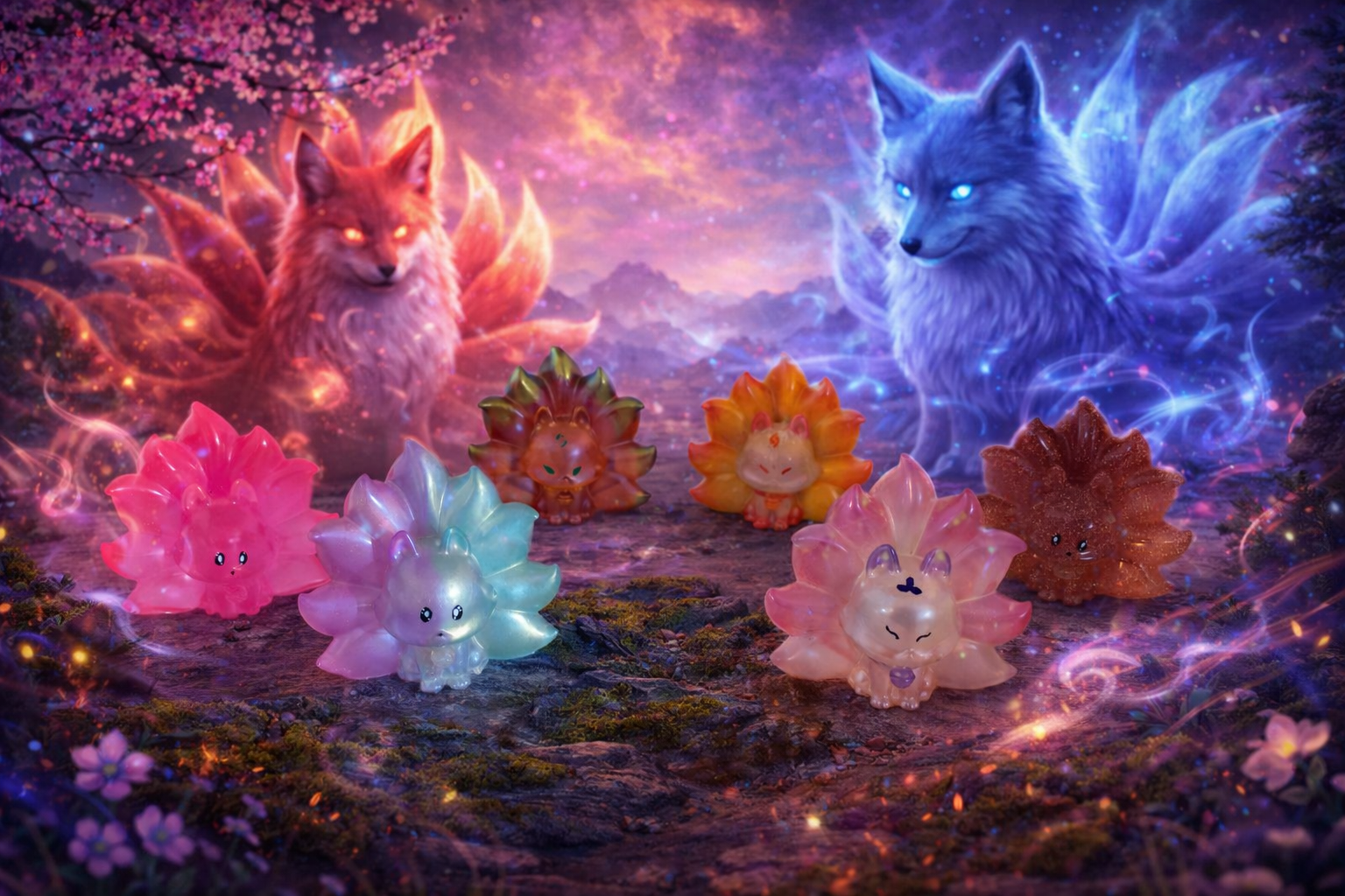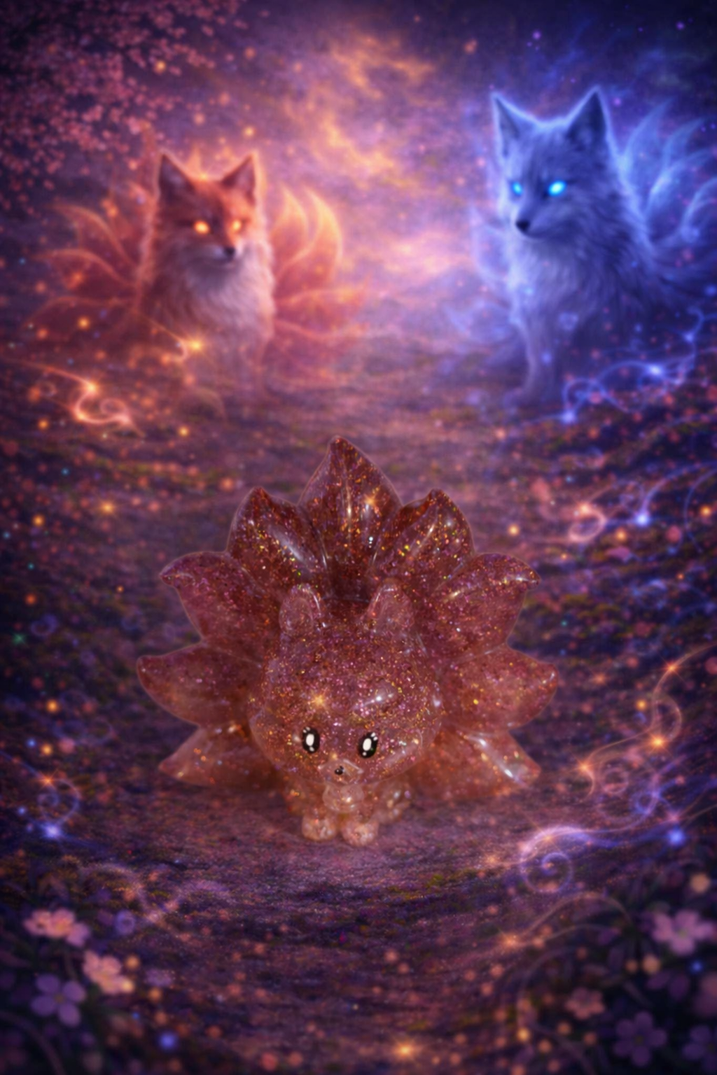 Renard kawaii vert et violet, Renard kawaii phospho rose, Renard kawaii paillettes, Renard transparent rose violet, Renard jaune orange rouge, Renard transparent violet vert